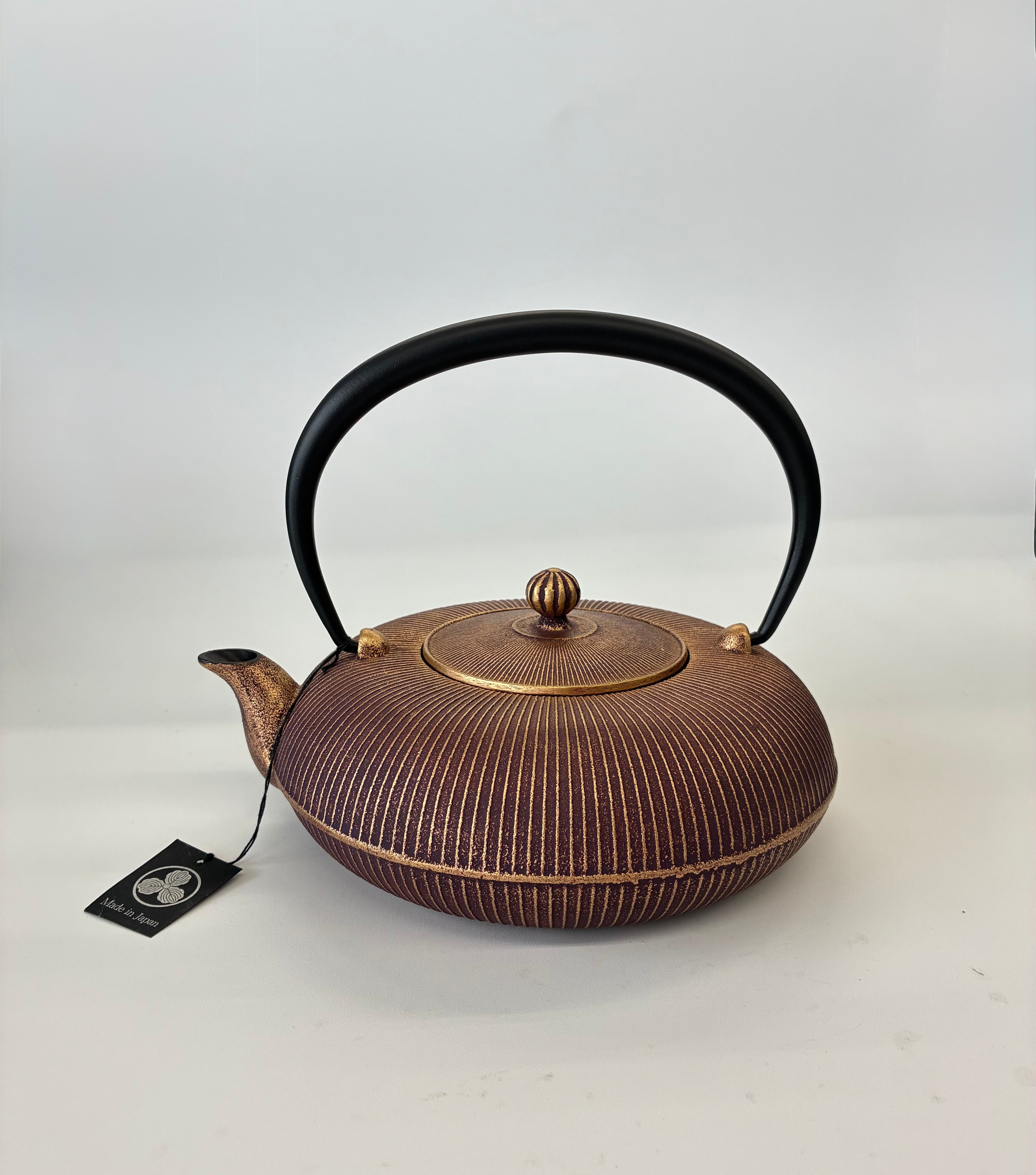 鉄瓶としてお湯を沸かし、茶漉しが付いているので、そのままお茶も淹れられます。 南部鉄器の急須はホーロー加工がしてあるものがほとんどで火にかけられませんが、 こちらの商品は鉄瓶と急須の両方で使用できますが、ホーロー加工してないので、お茶が入ったまま長時間置いておくとサビの原因になりますので気をつけてください。 縦に筋が入っていて、金と渋い紫の色合いが綺麗で贈り物にも最適です。